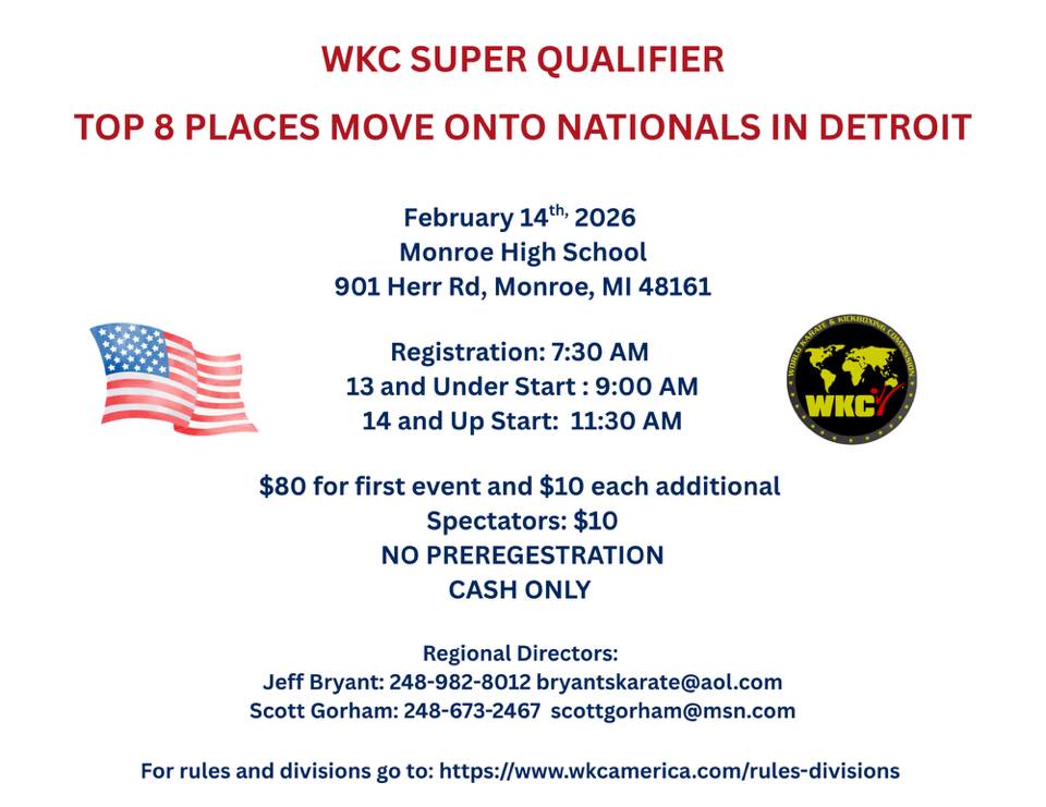Super Regional Exception: The Mid-East WKC Super Qualifier is designated as a Super Regional event, and for this tournament, the Top 8 competitors qualify for the USA Nationals.